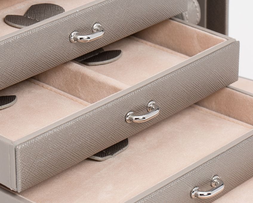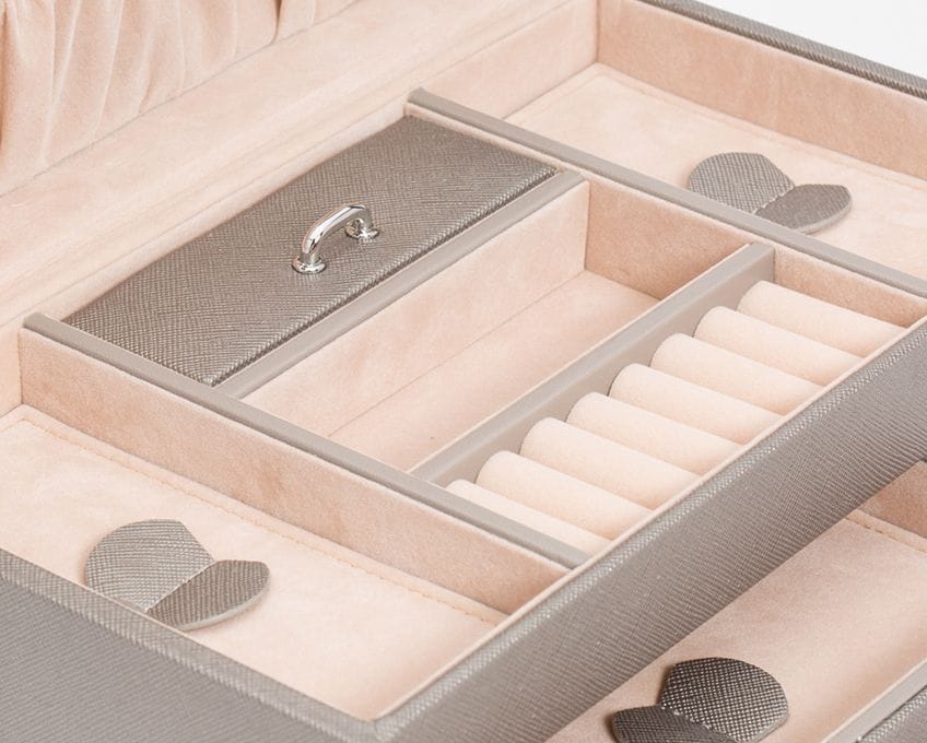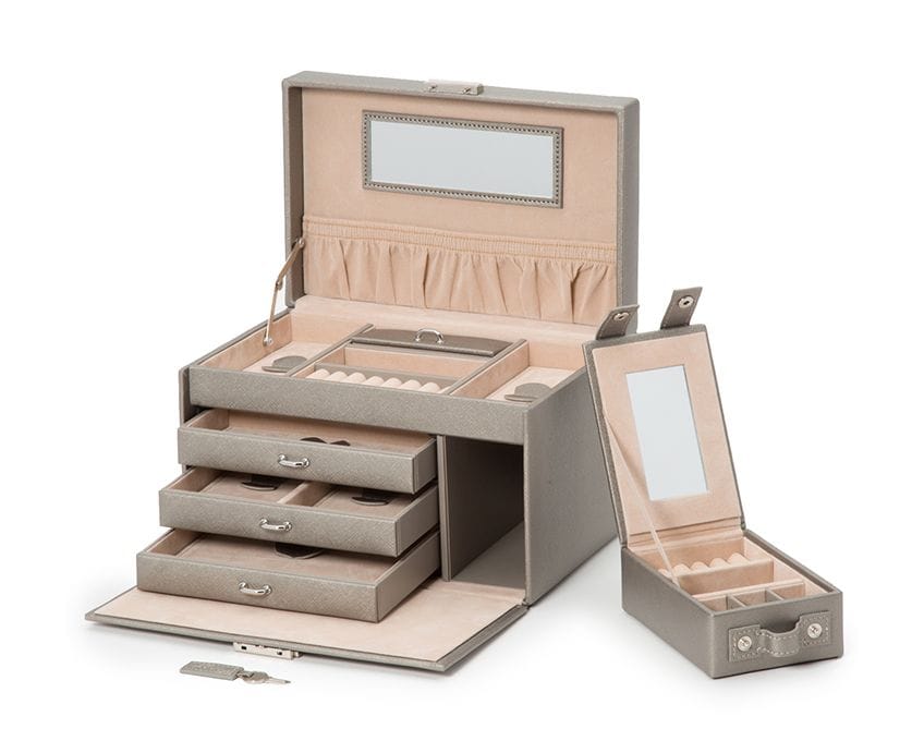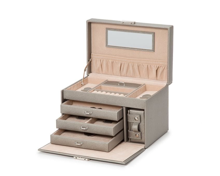 Wrapped in Pewter Saffiano faux leather and lined with soft ultra-suede, it helps prevent scratches while keeping your jewelry beautifully displayed and secure. Despite its smaller footprint, it offers generous storage, making it ideal for dressers, travel, or gifting.